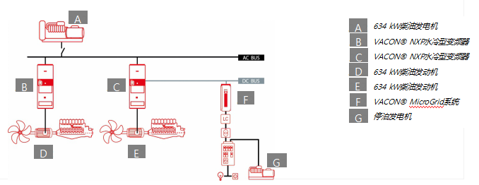 推进器和发动机系统:2台推进器,每台采用2台三菱634 kW柴油发动机 + 两台由2个VACON® NXP水冷型变频器控制的285 kW Baumüller电动力矩电机。