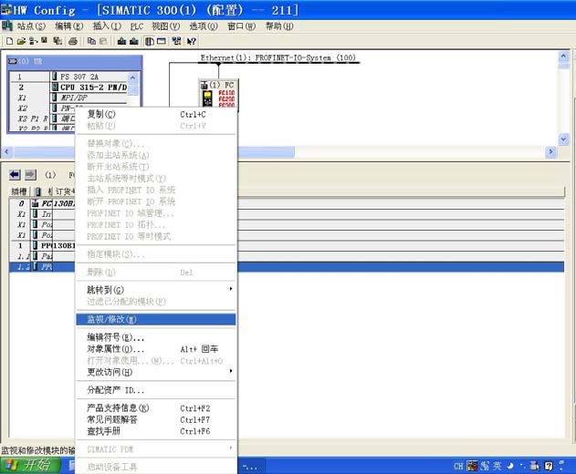 STEP7 硬件配置的 ONLINE 模式提供简易的在线调试功能,可以操作现场变频器, 检查配置和接线是否正确。在 ONLINE 模式,PLC 运行状态下,选中从站榴莲APP官方下载进入网站的 图标,再点击从站的 1.2 插槽,示例中显示为“PPO 4 – 6/6 Words,Danf~”模块,按鼠标 右键,选择“监视/修改(M)”。