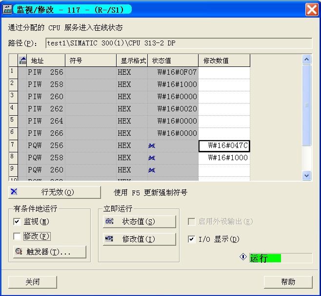 这时写入 PCD1 控制字(示例中地址为 PQW 256) = W#16#047C(此控制字含义为“运 行”);写入 PCD2 总线参考值(示例中地址为 PQW 258)= W#16#1000(含义为 25%),然 后按“修改值(I)”按钮,数据就能传送至变频器,如果此时变频器在 Auto-on 模式,控制 端子 12 与 27 短接,变频器就能正常运行,而且输出频率为 12.5Hz。