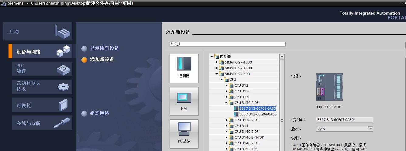 四、添加 PLC 主机,示例中使用的是 S7-300 (6ES7 313-6CF03-0AB0):