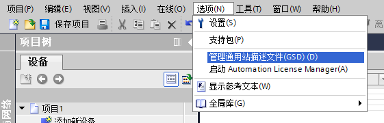 六、如果没有安装过 MCA102 的 GSD 文件,则需点击‘选项’-‘安装设备描述文件’, 操作如图六所示。若已安装则直接进入第七步。