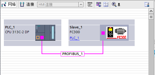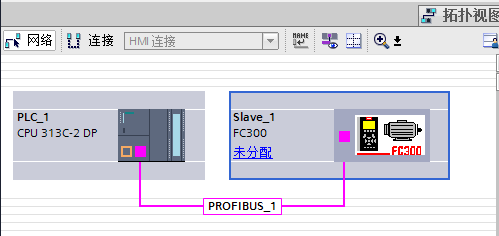 将变频器 FC300 拖动到 PROFIBUS_1 连接线处后,PLC 和变频器连接在一起,FC300 显 示为未分配。
