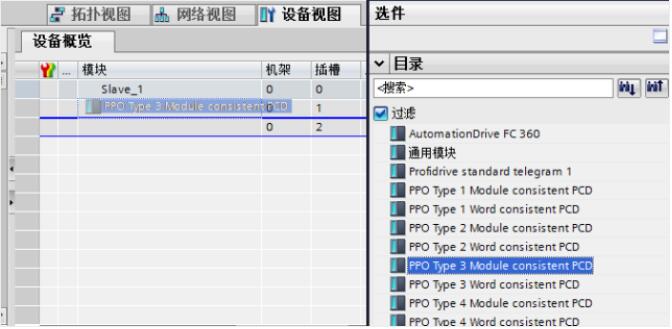 选择合适的 PPO 模块,将其拖动到插槽一的位置。例如下图选择 PPO Type3 Module consistent PCD,左键选择拖动到插槽一位置释放。