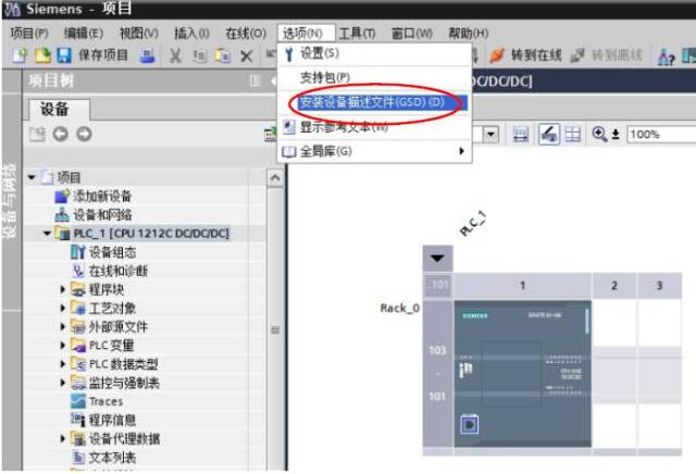 六、如果没有安装过 MCA120 的 GSD 文件,则需点击‘选项’-‘安装设备描述文件’,操作 如图五所示。若已安装则直接进入第六步。