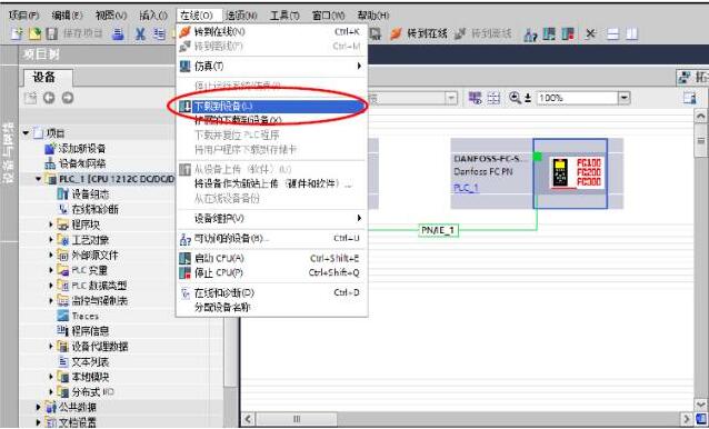 十一、下载项目至 PLC,选择“菜单”-‘在线’-‘下载到设备’,如图十三所示: