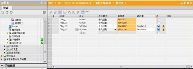 十三、调试:TIA 软件提供在线调试功能,可以现场操作变频器,检查配置和接线是否正确。 在在线模式下,在监控表中添加‘%IW68(STW)’、 ‘%IW70(MAV)’、 ‘%QW64(CTW)’、 ‘%QW66(MRV)’、如图十四所示: