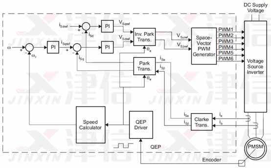 V/F方式是早期变频器驱动永磁同步电机的控制方式之一,这种方式需要放大变频器的功率,将永磁同步电机当作普通的交流异步电机,只做简单的压频比控制。同时,对永磁同步电机的感应电势波形要求较高,电机电流中含有不合理的磁场电流成分,无法体现出永磁同步电机高效节能的优势,还容易造成失速、过流等问题,因此现在已经不推荐使用了。