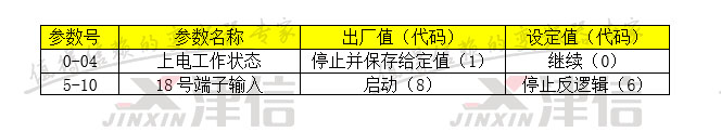 3. 通过面板按下面的参数分别在0号菜单设置上电工作状态,5号菜单设置18号端子输入值。