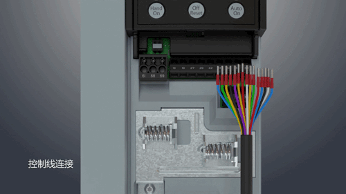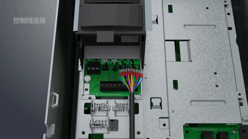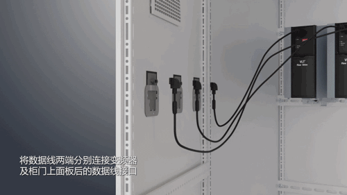 2、将数据线两端分别连接变频器及柜门上面板后的数据线接口