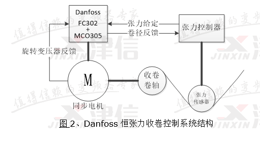 丹佛斯收卷张力控制系统由Danfoss驱动器(内置MCO305运动控制卡)、永磁同步电机和张力检测控制器构成,如上图2所示。张力检测控制器根据卷径信号和张力传感器的反馈信号,输出一个模拟量作为丹佛斯驱动器的张力参考值,丹佛斯驱动器负责驱动永磁同步电机,工作在闭环转矩控制模式下。永磁同步电机转子轴上安装旋转变压器作转子角度位置反馈。