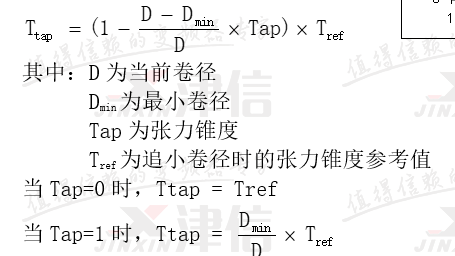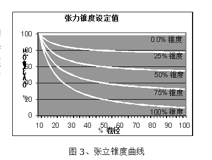 收卷张力锥度控制:有了当前卷径值,和张力锥度设定值,就能计算当前张力。张力与卷径的关系如图3所示,当张力锥度为0时,张力保持恒定不变,相当于恒张力控制;当张力锥度为100%时,卷径每增大1倍,张力就下降一半,相当于恒转矩控制。计算公式如下: