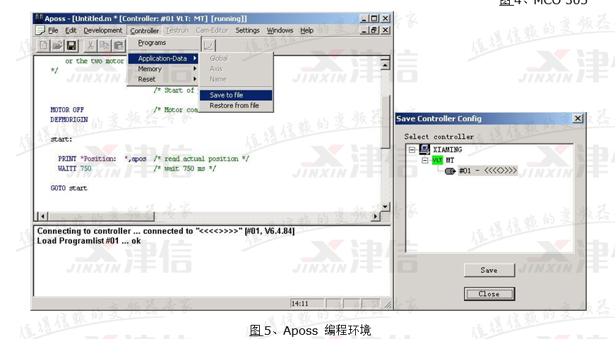 丹佛斯运动控制器使用丹佛斯公司开发的Aposs运动控制语言,其编程风格模仿C语言,并提供多种便利的宏指令,其界面如下图5所示: