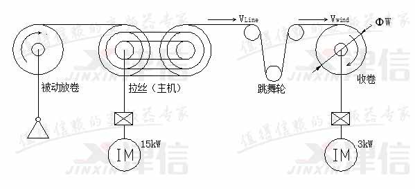 160型水箱拉丝机放卷为被动式放卷,主牵引为15kW交流异步电机,收卷用3kW交流异步电机,设计最高线速度为20米/秒。收卷为了与主机线速度同步并保持恒定张力,引入跳舞轮缓冲机构。由于跳舞轮上未安装伺服气缸,因此在正常运行过程中钢丝的张力只与跳舞轮及其上配重块的重量有关,而与跳舞轮的位置无关。