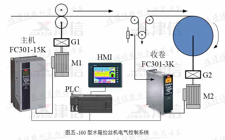 水箱拉丝机是子午线轮胎用钢帘线生产企业的关键设备,其收卷控制是变频器跳舞轮位置反馈控制。由于生产速度快,用量大,加上环境比较恶劣,因此要求采用性能优异,稳定性好,质量可靠和抗腐蚀能力强的变频器。我厂为拉拔0.22毫米以下线径的钢帘线定制了160型新型水箱拉丝机上,全部选用了丹佛斯最新推出的FC系列变频器作收卷和主传动驱动,取得了很好的运行效果。