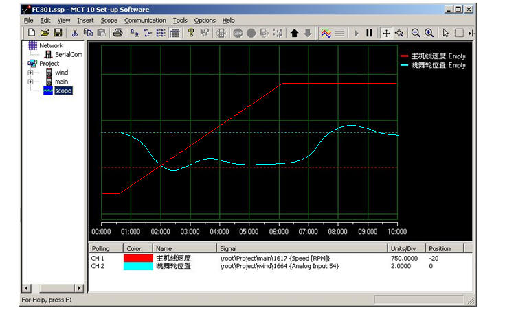 卷绕控制的特点:同样的一套PID调节参数,匀速时易于稳定,波动也较小;而加速时就不易于稳定,而且因为跳舞轮位置有静差,波动幅度也较大。因此PID调节参数主要针对加减速过程予以优化。MCT软件有数字示波器功能,通过实时观测线速度和跳舞轮位置在加减速时的变化曲线,能很方便地调整调节参数。