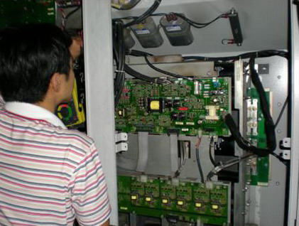 首先打开顶部风机盖板,取出顶部4个散热风机,露出散热片,用空压气体清理散片。将散热片清理干净后,更换两个损坏的风机 同时将剩下的两个散热风机也清理干净。安装好风机后,盖好风机盖板。将好的SOFTCHARGE CARD 、GATEDRIVE CARD安装好,换上新的快速熔断器和POWER CARD。最后将CONTROL CARD装好。变频器安装完毕。再次检查变频器的各个部分器件好坏,检查变频器的外围线路,确认满足变频器送电条件。给变频器送电,发现变频器散热风机运行正常,开机输出电压平衡,带负载运行正常。变频器成功修复。