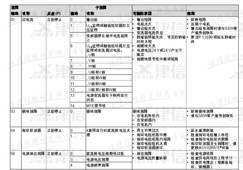SEW变频器故障代码,包括主故障代码和子故障代码,下表是F01,F03,F04,F06故障的相关内容: