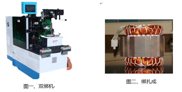 双绑机用于绑扎电机定子线圈,主要动作有定子铁芯分度,针杆进退、上下和角度控制,自动剪切线等,设有绑线张力调节器,可调节绑线的松紧。整机如图一所示,绑扎效果如图二。