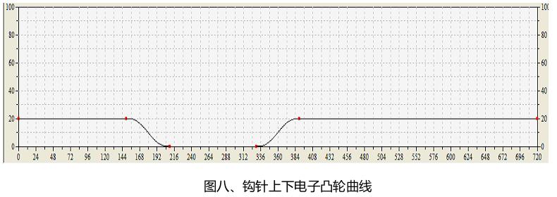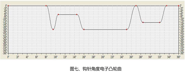 首先构建好凸轮曲线,使用“MC_CamTableSelect”指令选择对应的凸轮曲线;再通过“MC_Camin”指令使得主轴与从轴按照选定的凸轮曲线啮合(如图六所示)。构建完成的钩针角度电子凸轮曲线如图七所示,构建完成的钩针上下电子凸轮曲线如图八所示,