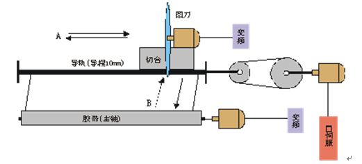 主轴电机用VFD-015M23A驱动,切台上的圆刀(切刀)用VFD-007M23A驱动,伺服与齿轮同轴相连,通过齿轮皮带带动导轨,使切台在如图中A所示方向来回移动,用来完成定长的操作。同时切台通过油压可以在如图中B所示方向前后移动,用来对套在主轴上的胶带进行切割。