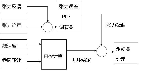 由于采用以上技术方案,使得排线平整,进而使收线伺服的控制是典型的中心卷绕控制。中心卷绕控制原理框图如图3所示。根据收线伺服当前实际转速计算需要的开环给定量,同时通过跳舞轮反馈引入张力调节,最终确定收线伺服驱动器的给定量。