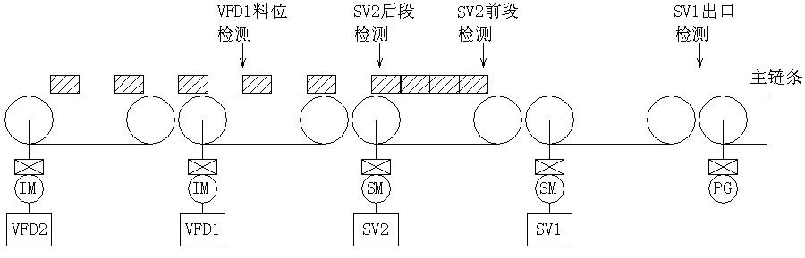 在图1中,VFD1料位检测传感器没有检测到物料时,VFD2以稍高于VFD1的速度,二者均高速运行。当检测到物料时,同时降速运行,但VFD2速度仍稍高于VFD1。此时SV2和SV1以及包装机并未运行。在图2中可以看到在SV2后段检测传感器检测到物料以后,SV2启动。当SV2前段检测传感器检测到物料且SV2后段传感器依然有信号时,启动包装机,此时SV1也启