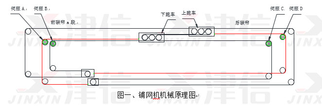 新型铺网机的工作原理见图一,其中伺服A为下跑车的驱动伺服,决定了下跑车的运行速度;下跑车就是铺网头,下跑车的速度就是铺网机的铺网速度。伺服B驱动前碳帘运行,前碳帘a段速度是铺网机的原料输入速度,要与前端设备速度同步。伺服C驱动上跑车运行。伺服D驱动后碳帘运行。伺服E驱动底帘运行。前碳帘在下跑车出口处的速度就是原料的出口速度。如果要求均匀铺网,则出料速度必须等于下跑车速度的绝对值;另外要求原料输入速度要等于Vi,保持恒定不变。根据上述两条基本运动约束条件,可以分别推算出各台伺服在铺网时的运行速度特征曲线。