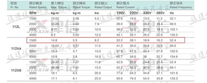 然后查询相关技术数据,发现SF-112XA电机的恒功率区域转速一直可以达到6000rpm,而现场实际只用到3000rpm,因此完全能够满足应用需要。
